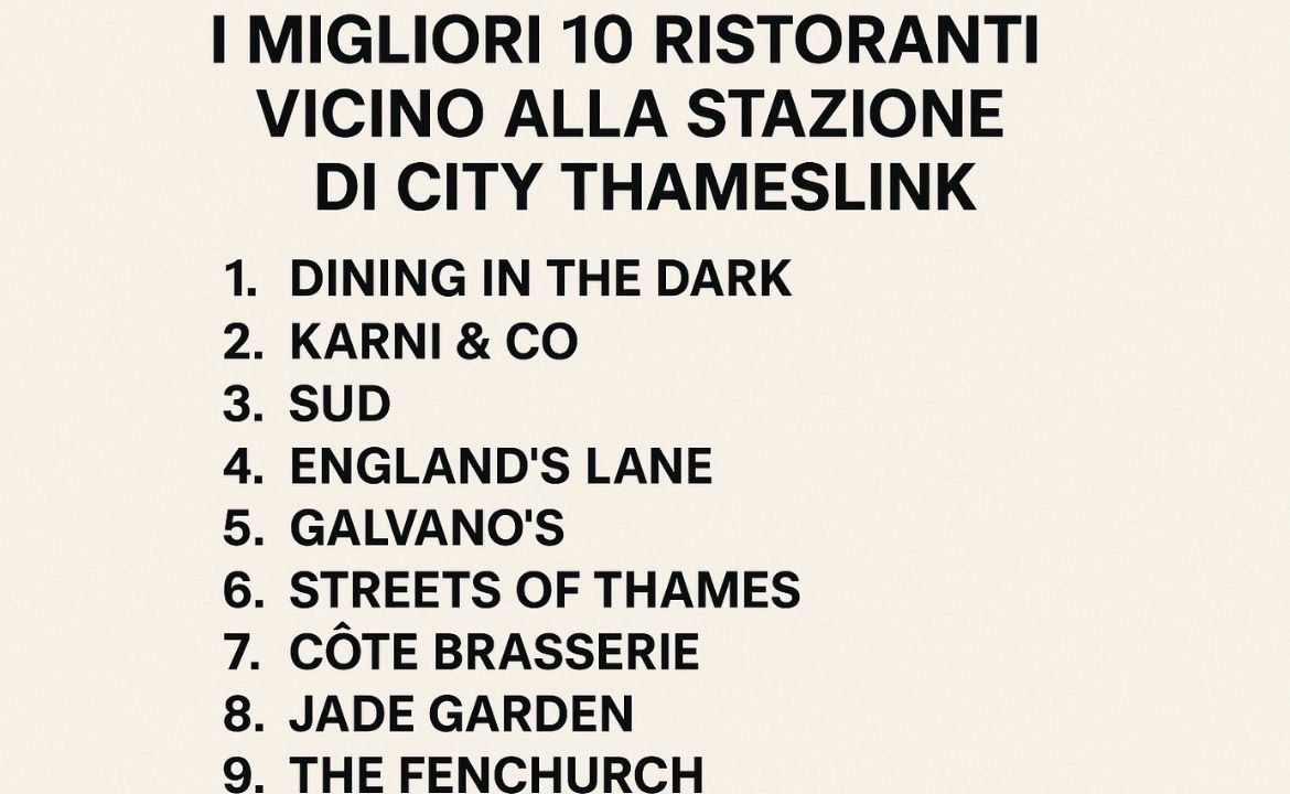 187 Se stai cercando i migliori 10 ristoranti vicino alla stazione di City Thameslink, sei nel posto giusto. Questa guida ti aiuterà a orientarti tra le opzioni più interessanti per mangiare bene nei dintorni, sia per una cena rilassata che per un pranzo veloce. Qui sotto trovi una selezione curata, con dettagli su cucina, atmosfera, posizione e consigli per scegliere il ristorante perfetto in base al momento della giornata. Table of Contents Perché scegliere ristoranti vicino a City Thameslink?Criteri di selezioneI migliori 10 ristoranti vicino alla stazione di City Thameslink1. Terra Rossa – St Paul’s2. The India – Fleet Street3. Franco Manca4. The Real Greek – St Paul’s5. Humble Grape6. Indian City – Best Authentic Indian7. CORD by Le Cordon Bleu8. The Conductor9. Rucoletta10. The Sushi Co – HolbornDettagli & consigli utili per la sceltah3: Quando andare (pranzo, cena, pausa veloce)h3: Atmosfera vs prezzoh3: Specialità e preferenzeCome usare questa guida al meglio Perché scegliere ristoranti vicino a City Thameslink? Situata nel cuore della City di Londra, la stazione City Thameslink è ben collegata e vicina a molti quartieri storici e business. Dopo una giornata di lavoro, oppure se stai solo passando per la città, può essere comodo trovare un buon ristorante nelle immediate vicinanze: meno tempo in trasporto, più tempo per godersi il pasto. Inoltre, le zone circostanti (St Paul’s, Fleet Street, Blackfriars, Ludgate Hill) sono ricche di atmosfera e offrono una varietà culinaria notevole: piatti italiani, indiani, moderni europei e anche opzioni più casual. Ora andiamo insieme alla scoperta dei migliori 10 ristoranti vicino alla stazione di City Thameslink. Criteri di selezione Prima di elencarti i ristoranti, ti spiego i criteri che ho usato per la selezione: Vicinanza alla stazione (ragionevole distanza a piedi) Qualità dei piatti (recensioni, fama locale) Atmosfera: dal rilassato al sofisticato Varietà di cucine per accontentare gusti diversi Disponibilità (molti anche per pranzo, altri per cena) Con questi in mente, vediamo la top 10. I migliori 10 ristoranti vicino alla stazione di City Thameslink 1. Terra Rossa – St Paul’s Posizione: a pochi minuti dalla stazioneCucina: italiana, mediterraneaPerché vale la pena: piatti pugliesi autentici, atmosfera calda e accogliente. Perfetto per chi ama la cucina italiana raffinata ma non troppo formale.(Citato su OpenTable tra i ristoranti vicini a City Thameslink) 2. The India – Fleet Street Posizione: nel quartiere di Fleet StreetCucina: indiana / asiaticaPunti di forza: ottimi piatti curry, ambiente informale ma ben curato. Ideale se vuoi un pasto saporito dopo una giornata intensa.(Appare nella classifica di Tripadvisor “The 10 Best Restaurants Near City Thameslink Station”) 3. Franco Manca Posizione: vicinissimoCucina: italiana / pizzaMotivo per provarlo: pizza con impasto a lunga lievitazione, atmosfera informale, ottima scelta per un pasto veloce ma gustoso. 4. The Real Greek – St Paul’s Posizione: zona St Paul’sCucina: greca / mediterraneaPerché sceglierlo: piatti classici greci, mezzè, ingredienti freschi. Ottima opzione se preferisci sapori leggeri e conviviali. 5. Humble Grape Posizione: vicino alla stazioneCucina: cucina europea contemporaneaCosa lo distingue: ottima carta dei vini, piatti stagionali curati. Perfetto per una cena rilassata con buon vino. 6. Indian City – Best Authentic Indian Posizione: poco distanteCucina: indiana autenticaPunti di forza: grandi porzioni, spezie ben bilanciate, ambiente accogliente. Ottima alternativa se vuoi restare sulla cucina asiatica. 7. CORD by Le Cordon Bleu Posizione: vicino a St Paul’s / Fleet StreetCucina: internazionale / di alta cucinaPerché provarlo: cucina raffinata, menu degustazione, ambiente elegante. Ideale per occasioni speciali.(Citato su OpenTable) 8. The Conductor Posizione: proprio di fronte a City Thameslink StationCucina: pub / condivisa / piatti classiciMotivo per includerlo: comodissimo per la sua posizione, piatti adatti per condividere, atmosfera rilassata. Perfetto per un pasto “last minute”. 9. Rucoletta Posizione: St Paul’s areaCucina: italianaCosa offre: pasta fatta in casa, piatti semplici ma ben eseguiti, ottima scelta per chi preferisce un ambiente tranquillo ma gustoso. 10. The Sushi Co – Holborn Posizione: Holborn, non troppo lontanoCucina: giapponese / sushiPunti di forza: atmosfere moderne, buon sushi, opzioni fresche. Ottima variazione se vuoi uscire dal mediterraneo / asiatico classico. Dettagli & consigli utili per la scelta h3: Quando andare (pranzo, cena, pausa veloce) Per un pranzo veloce, scegli Franco Manca, The Sushi Co o Indian City, che generalmente offrono menu rapidi e un servizio efficiente. Per cena più rilassata, Terra Rossa, CORD, The Real Greek o Humble Grape sono ottime scelte. Se sei proprio accanto alla stazione e non vuoi camminare molto, The Conductor è perfetto per un boccone pratico. h3: Atmosfera vs prezzo Se il budget non è un vincolo e vuoi un’esperienza elegante, punta su CORD by Le Cordon Bleu o Humble Grape. Per opzioni più casual senza rinunce al gusto, The India, Indian City, Rucoletta sono ottime scelte. The Conductor è una via di mezzo comoda e informale grazie alla sua posizione strategica. h3: Specialità e preferenze Amanti della pizza/italiano: Terra Rossa, Franco Manca, Rucoletta Cucina etnica / asiatica: The India, Indian City, The Sushi Co Esperienze gastronomiche raffinate: CORD, Humble Grape Praticità e vicinanza: The Conductor Come usare questa guida al meglio Verifica gli orari: alcuni ristoranti potrebbero chiudere tra pranzo e cena o avere giorni di chiusura. Prenota in anticipo: specialmente per CORD o Terra Rossa, nei momenti di punta è meglio prenotare. Cammina con calma: le distanze sono ragionevoli, ma considera che il centro della City ha vie tortuose. Controlla il menu online: ti dà un’idea dei prezzi e ti assicura che ci siano l