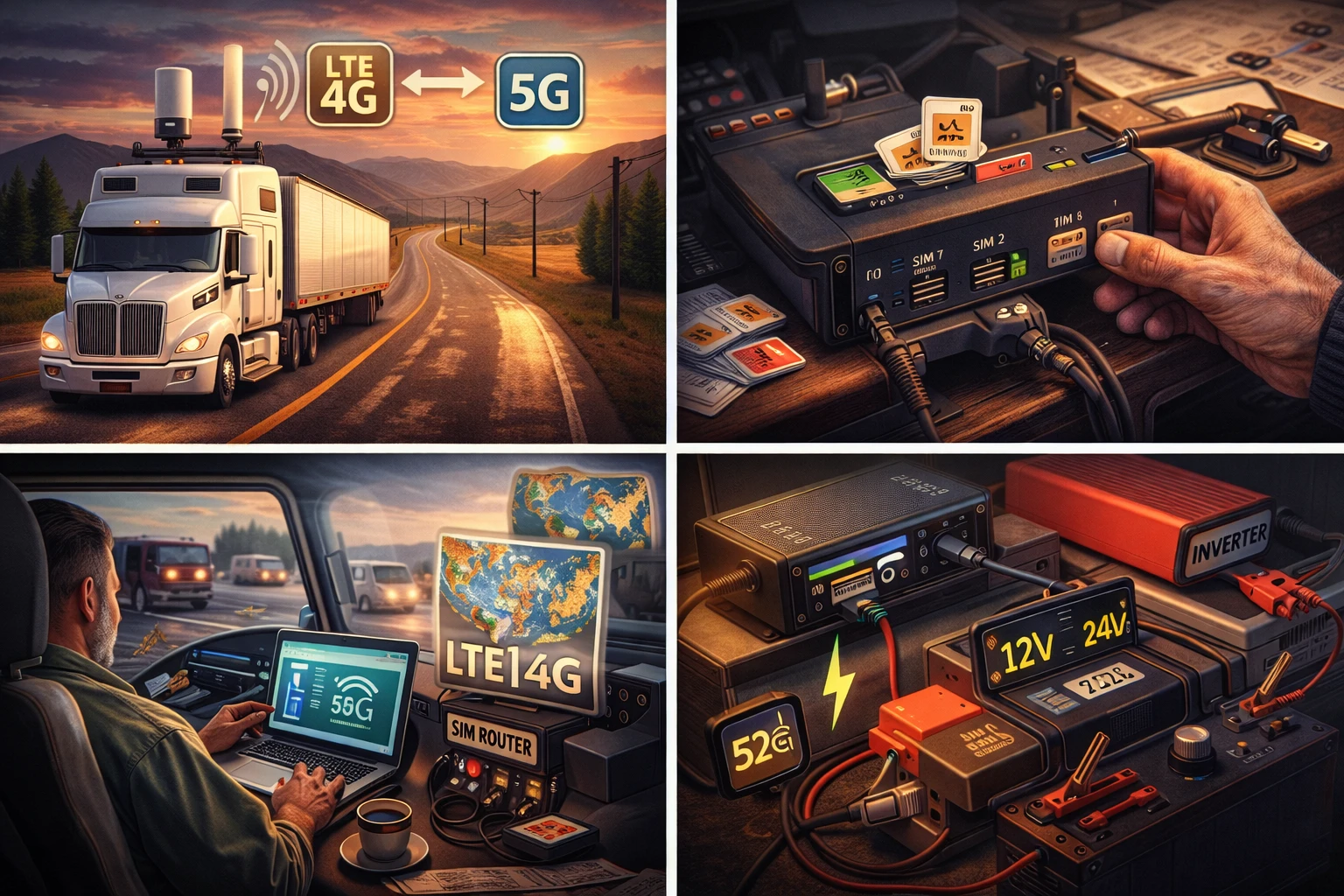 108 In the case of modern-day truck drivers, mobile connectivity is an indispensable tool that helps one perform almost all of the work-related tasks. Dispatch updates, an electronic logging device (ELD) sync, document uploads, GPS navigation, and communication with family are all premised on the availability of a reliable mobile connection. Typically, it is a topic of discussion that usually begins with talking about LTE and 5G, but for long-haul drivers, it’s a matter of a stable network, good hardware choices, and stable power inside the cab that they need to think about. The question is less about trying to run the fastest speed tests for the vehicle network setup process but more about edging out the competition by following the spelling of the route closely, picking the correct router for vehicles, using an external antenna, power control, knowledge of the isolated areas where one can lose the signal-cause so on. The guide that follows directly focuses on the pieces of equipment and tools that work well in extremely long trucking conditions. Table of Contents LTE vs 5G: What Matters on the HighwayCoverage Maps: The Starting PointChoosing the Right Router for VehiclesExternal Antenna and MIMO: Why Cab Installation MattersSignal Booster: When It HelpsPower Management: 12V/24V vs InverterSIM/eSIM Strategy for Multi-State DriversLatency, Speed Tests, and Real-World PerformanceRural Coverage: The Real Stress TestCab Installation: Clean Setup Equals StabilityTroubleshooting Connectivity on the RoadBuilding a Balanced Connectivity Setup LTE vs 5G: What Matters on the Highway On the face of it, 5G is the more attractive of the two options as it comes with lower latency and higher speeds. However, in practice, the LTE network still has more coverage in greater areas, especially in the instances of rural coverage. Here is how they fare in the specific case of trucking: FeatureLTE (4G)5G (Sub-6)5G (mmWave)Coverage AreaWide, matureExpandingVery limitedRural CoverageStrongModerateRareLatency30–50 ms10–30 msVery lowStability on HighwaysProvenImprovingLimitedUrban PerformanceGoodExcellentExcellent On the majority of the routes truck drivers who operate in agricultural regions, oilfield routes, and mountain corridors find it more reliable to use LTE. Infrequent use in metropolitan freight hubs, but it has to be paired with an LTE fallback. In practice, one does not have to make a decision on hardware that supports only LTE or 5G – it is possible to choose a hardware that works with both signals and intelligently switches. Coverage Maps: The Starting Point The majority of drivers decide on their data plans according to either their budget limit or their “unlimited” marketing claims. However, a more viable option is to take coverage maps into consideration and focus on the specific lanes you take. The interstate corridors normally have strong signals but the moment that you exit towards a rural shipper, then the signal strength may drop noticeably. For those who have carrier maps for the highway routes, remote delivery zones, and cross-state roaming performance, it will be much easier to find what the company promises in terms of peak speed. The parameters that need to be compared between the data plans are: Highway coverage stability Rural coverage strength Congestion performance Throttling thresholds Coverage consistency is of paramount importance compared to occasional 200 Mbps speed tests. Choosing the Right Router for Vehicles A smartphone hotspot works for light use. But for professional trucking, a dedicated router for vehicles offers better signal handling, stronger Wi-Fi distribution, and stable power input. Industrial-grade routers are built to tolerate heat inside the cab and often support dual SIM or SIM/eSIM router configurations. That flexibility allows drivers to switch carriers when signal decreases. When choosing equipment, many drivers also research the best Wi-Fi for truckers — not just cellular connectivity, but solutions that provide strong in-cab access for multiple devices, stable distribution, and seamless transitions between LTE/5G and local Wi-Fi hotspots. The best router features that one needs to consider are: FeatureWhy It MattersDual SIM SupportCarrier failover in weak zonesExternal Antenna PortsImproved rural coverageMIMO CapabilityStronger throughput in low signalDC 12V/24V InputDirect truck power compatibilityHeat-Tolerant DesignStability in hot cab conditions Having the Dual SIM routers is especially valuable in the freight that is delivered across the country where there is a variation in the network performance based by the location. External Antenna and MIMO: Why Cab Installation Matters The metal construction of the truck cab significantly decreases the cellular signals. The internal router antennas have difficulties because the metal reflects and absorbs radio waves. It is for this reason that an external antenna is one of the most effective upgrades for mobile connectivity. A roof-mounted antenna clears the signal path so that wireless communication, for instance, in a rural area can be improved dramatically and at the same time, the reconnection cycles can be dramatically reduced. The addition of a MIMO antenna enables multiple signal streams, which leads to the improvement of data processing and the establishment of stable performance in the weak signal areas. In actual trucking situations, the determination of antenna position can simply be more essential than switching from LTE to 5G. How to Install an LTE Antenna and Router in a Camper Van for Fast Internet Everywhere Signal Booster: When It Helps A signal booster is a device that receives weak signals and amplifies them to a better quality before they can reach your router. This device is useful in cases of a remote freight lane but is not fulfilling for all purposes. The most effective boosters are those occupying the place where there is a fair and weak signal. They cannot create a signal